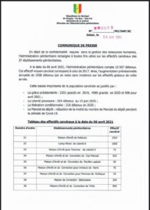 Dans un communiqué publié par nos confrères de libération sur sa page Facebook, la direction de l’administration pénitentiaire vient divulgué l’effectif total des 37 établissements carcéraux au senegal. Le nombre totale est estimes a 10.507 détenus date du 6 avril (Dap)
