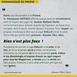 « Dans une déclaration à la Presse, M. Ousmane Sonko affirme que je serai en accointance avec le Doyen des juges M. Oumar Maham Diallo, certainement pour asseoir auprès de l’opinion, la thèse d’un complot dont il serait victime devant la justice. Pour étayer ses propos, il va jusqu’à dire que le juge Diallo serait le père d’une fille qui porte mon prénom : Aïssata Tall Sall.