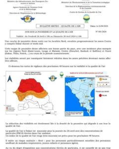 L’Agence Nationale de l’Aviation Civile et de la Météorologie (ANACIM) a émis une alerte concernant une couche de poussière dense qui va affecter les régions du Nord, du Centre, et le Littoral du Sénégal.