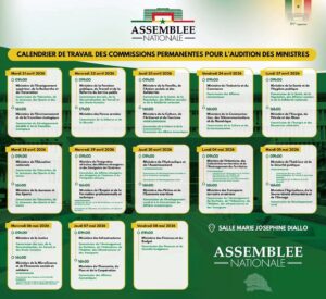 Les auditions démarreront dès demain mardi 21 avril. Deux ministres feront face aux députés : Daouda Ngom, en charge de l’Enseignement supérieur et Abdourahmane Diouf, ministre de l’Environnement. Ci-joint ledit calendrier.