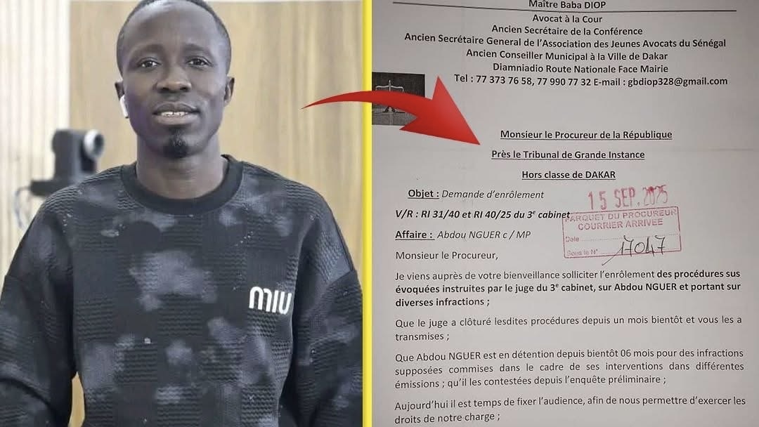 Les avocats du chroniqueur Abdou Nguer, détenu depuis près de six mois à la prison de Rebeuss, ont officiellement saisi le Procureur de la République près le Tribunal de Grande Instance de Dakar pour demander l’enrôlement de son dossier et la fixation d’une audience. Dans une lettre datée du 11 septembre 2025, signée par Me Baba Diop, la défense dénonce un “retard injustifié” dans le traitement de l’affaire, alors que l’instruction est clôturée depuis près d’un mois.