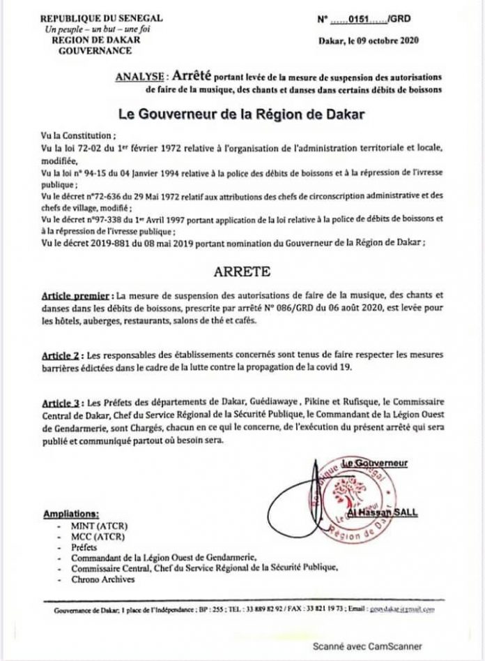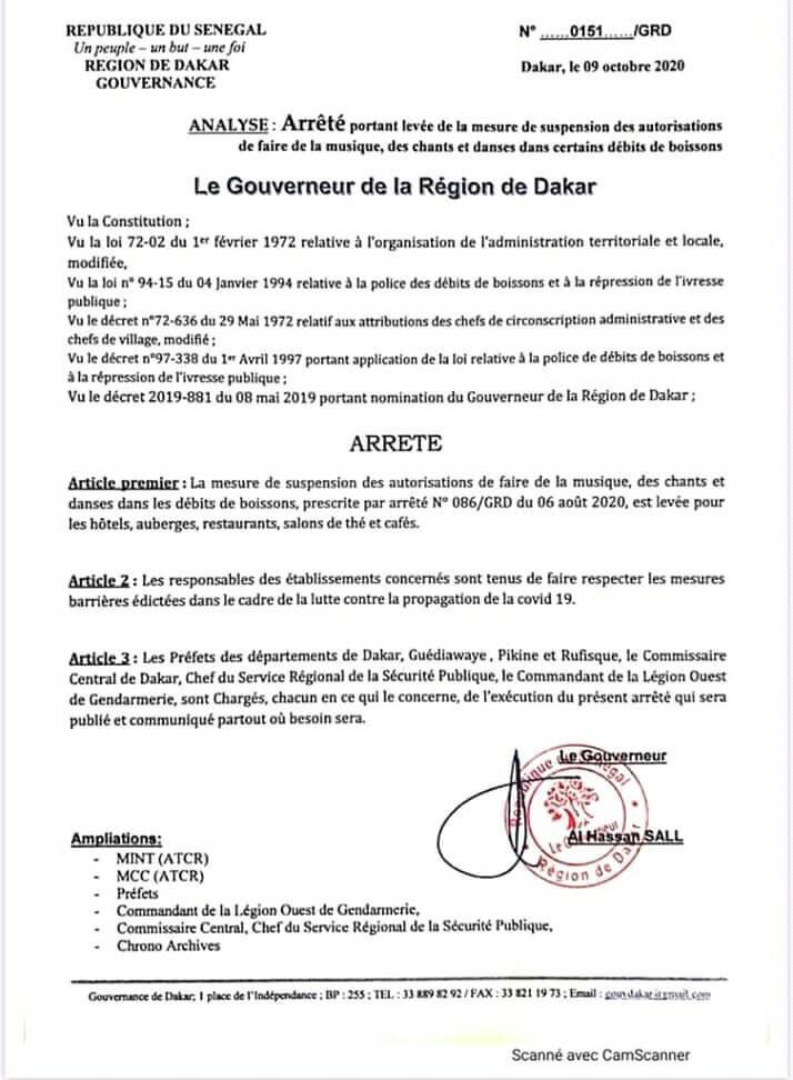 Arrêté portant levée de la mesure de suspension des autorisations de faire de la musique, des chants religieux et danses dans certains débits de boisson.