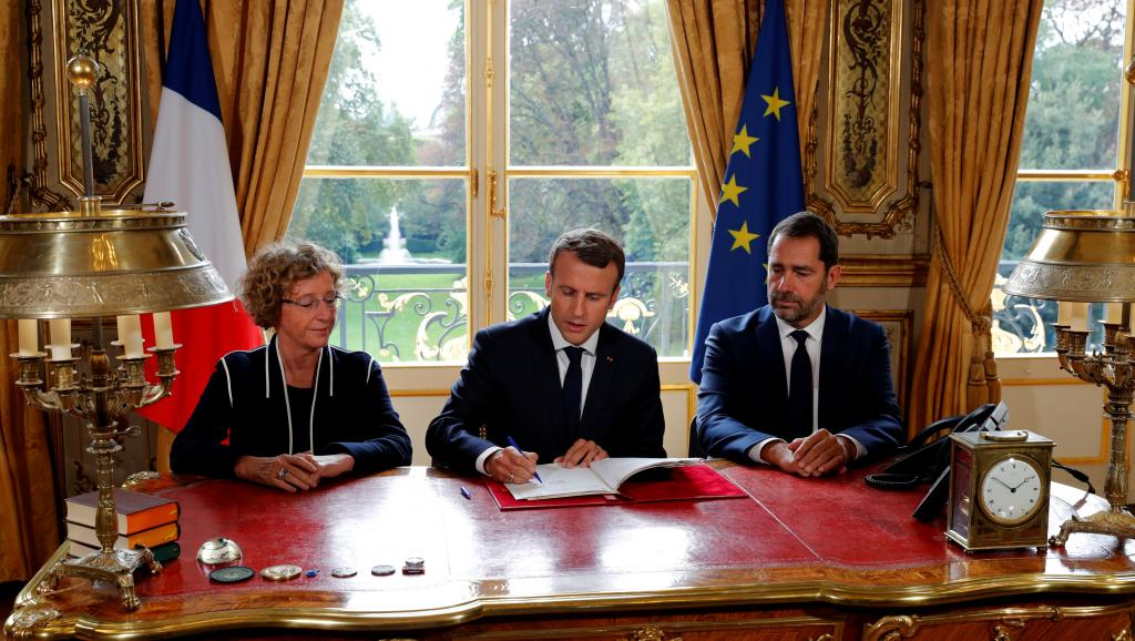C’est la réplique d’Emmanuel Macron à la rue : la signature devant les caméras des cinq ordonnances réformant le Code du travail, la ministre du Travail, Muriel Pénicaud, et le porte-parole du gouvernement, Christophe Castaner, à ses côtés. Le même cérémonial que la semaine dernière lors de la promulgation de la loi de moralisation de la vie publique. Une mise en scène « à l’américaine» pour donner l’image d’un chef de l’Etat qui applique son programme.