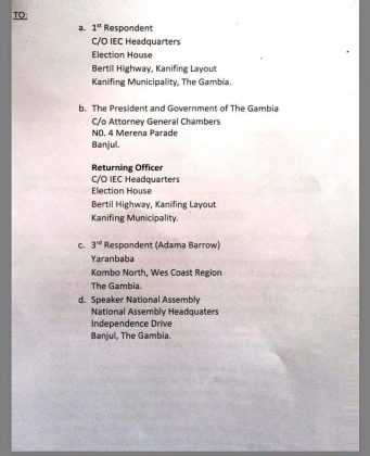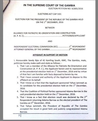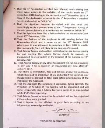 Edu Gomez est aussi le procureur général de Gambie, agissant directement sous les ordres du ministre de la justice; donc du State House, le coeur du pouvoir de Banjul. Dans sa citation, il demande à la Cour d’interdire à Adama Barrow de procéder à sa prestation de serment, comme il s’y est engagé à le faire, ce jeudi prochain, 19 janvier 2017.
