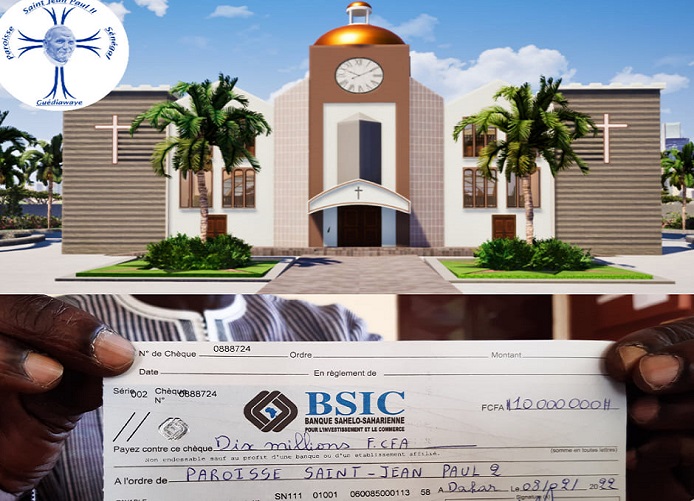 «Toute la Communauté catholique de la Paroisse Saint Jean-Paul 2 reconnaissante envers Monsieur Lat Diop (Lat Diop Officiel ), pour le chèque de 10.000.000 FCFA remis gracieusement pour le compte de la Construction de l’Église Paroissiale »