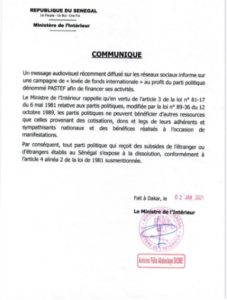 Car, “tout parti politique qui reçoit des subsides de l’étranger ou d’étrangers établis au Sénégal s’expose à la dissolution, conformément à l’article 2 alinéa 4 de la loi de 81 susmentionnée“, souligne le document que nous vous livrons un extenso.