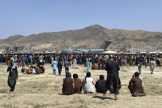 Hundreds of people gather near a U.S. Air Force C-17 transport plane at the perimeter of the international airport in Kabul, Afghanistan, Monday, Aug. 16, 2021. On Monday, the U.S. military and officials focus was on Kabul's airport, where thousands of Afghans trapped by the sudden Taliban takeover rushed the tarmac and clung to U.S. military planes deployed to fly out staffers of the U.S. Embassy, which shut down Sunday, and others. (AP Photo/Shekib Rahmani)