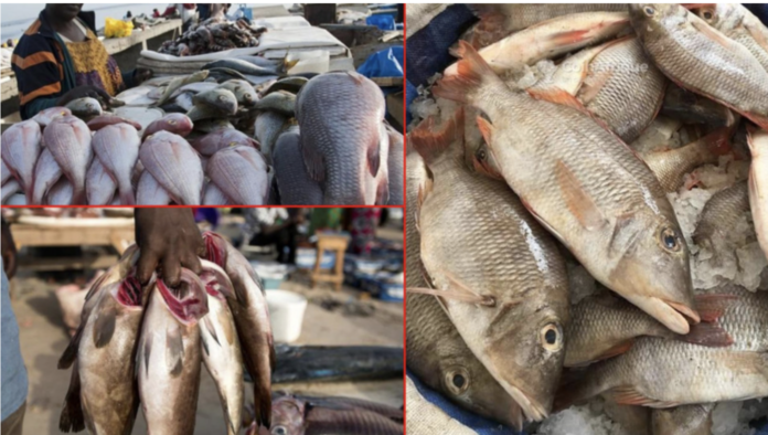 « Il y’a pas de poisson… », souffle notre interlocuteur. Rencontré au cœur du marché où il tient son étale. Portant des bottes de pluies vers pour pouvoir se déplacer aisément dans les flaques d’eau il contourne la table où il expose ses produits. « Jadis le poisson qui se vendait par tas se vend maintenant par kilo. Les poissons se vendent par kilo, Kilo 3200 Fcfa, 3500 ou 4000 alors que le kilo c’était entre 2000 et 2500. Les dorades se vendaient par tas, 2000 ou 3500 ou la caisse de dorades à 25.000. C’est temps-ci la caisse de 20 kilos coûte 50.000 Fcfa », explique Ousseynou.