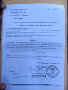 Le préfet de la ville de Guédiawaye vient de sortir l’arrêté portant interdiction de la marche projetée pour le samedi 25 octobre 2025 de 15 heures à 18 heures 30 minutes et sur l’itinéraire : Rond-point Mor FADAM – quartier Cheikh WADE – Esplanade de Wakhinane Nimzatt, initiée par Djiby FALL, Boubacar KANE et Serigne Fallou SOW pour la libération de l’ancien ministre, Lat Diop.