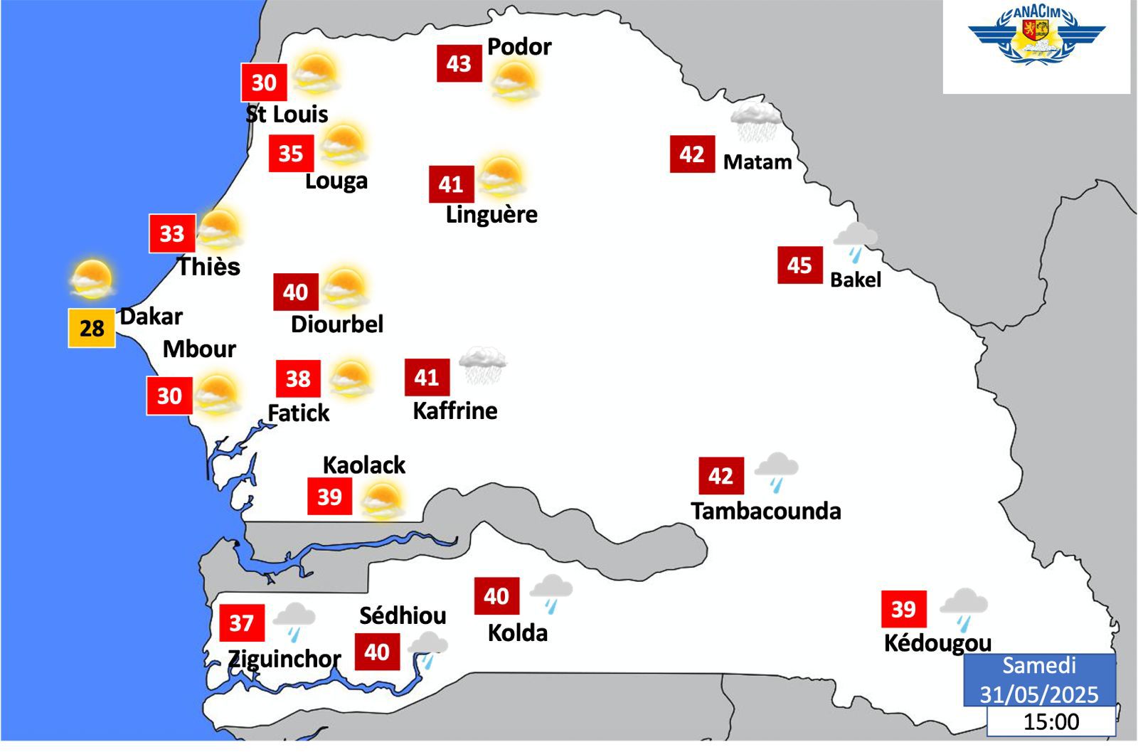 L’Agence nationale de l’aviation civile et de la météorologie (Anacim) a annoncé ce mercredi 25 juin 2025 un temps contrasté sur le territoire sénégalais, marqué par des averses orageuses localisées au Sud et une chaleur intense dans les régions intérieures.