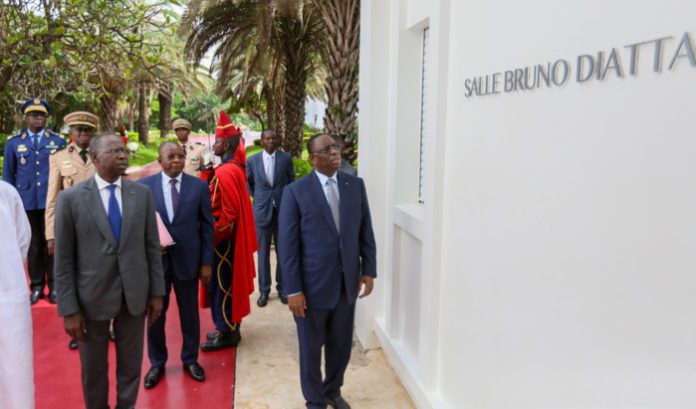 La salle du conseil des Ministres porte depuis ce matin, le nom de Bruno Diatta, défunt Ministre Chef du Protocole de la Présidence. Le Président Macky Sall a dévoilé la plaque avant la réunion hebdomadaire du conseil des Ministres. Une reconnaissance de l’oeuvre impérissable de Bruno Diatta et de ses bons et loyaux services.