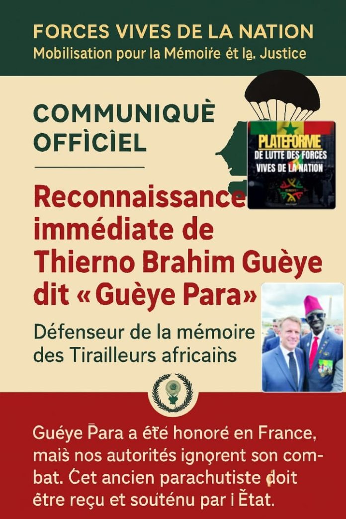 Au nom des Forces Vives de la Nation, nous portons à l’attention de l’opinion publique nationale et internationale la situation préoccupante d’un homme dont le parcours et l’engagement devraient être salués avec la plus haute considération : Thierno Brahim Guèye, connu sous le nom de Guèye Para, ancien parachutiste de l’armée sénégalaise, formateur exemplaire, et aujourd’hui porte-étendard de la mémoire des Tirailleurs africains.