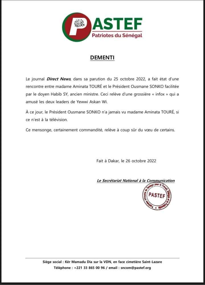 Le PASTEF de poursuivre :” Le Président Pusmane Sonko n’a jamais vu Madame Aminata Touré, si ce n’est à la télévision “.
