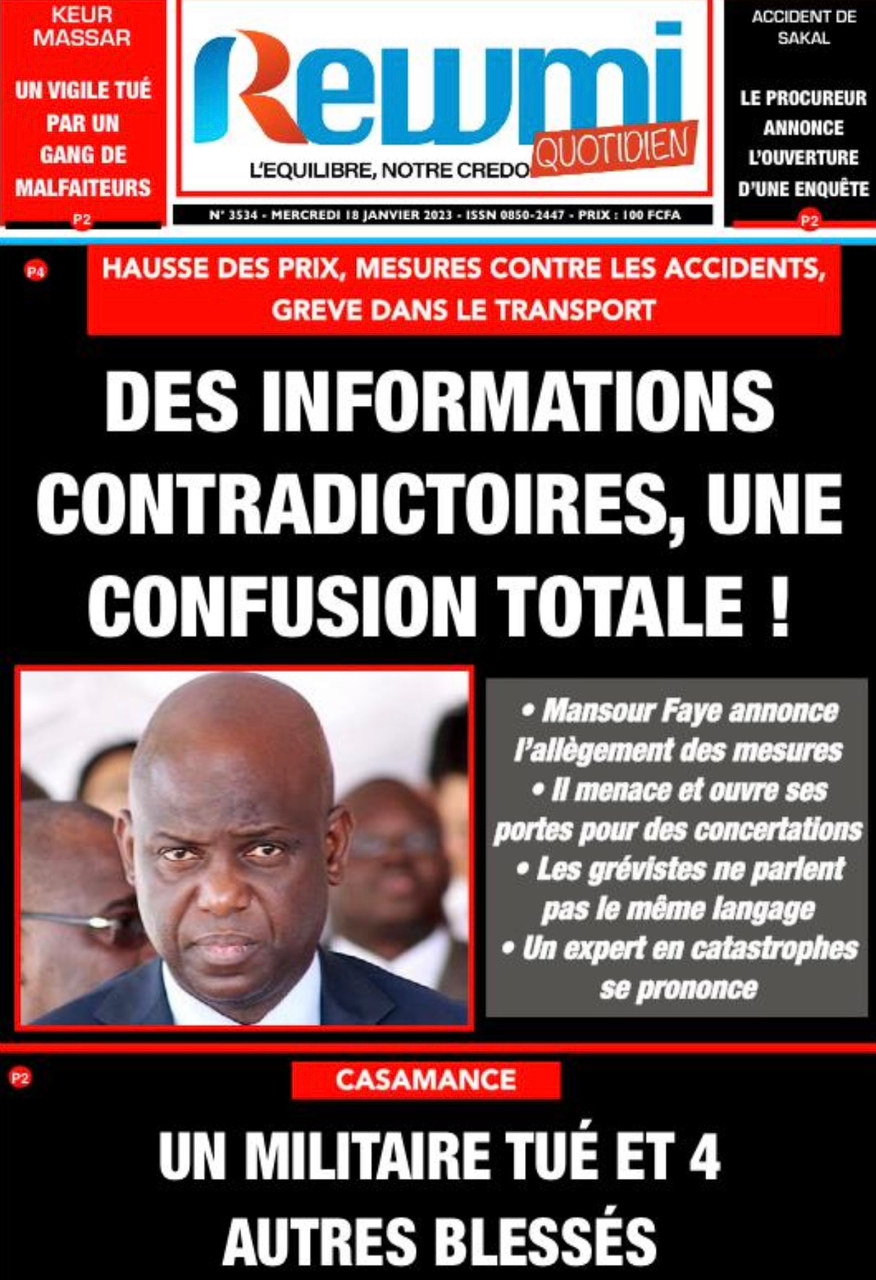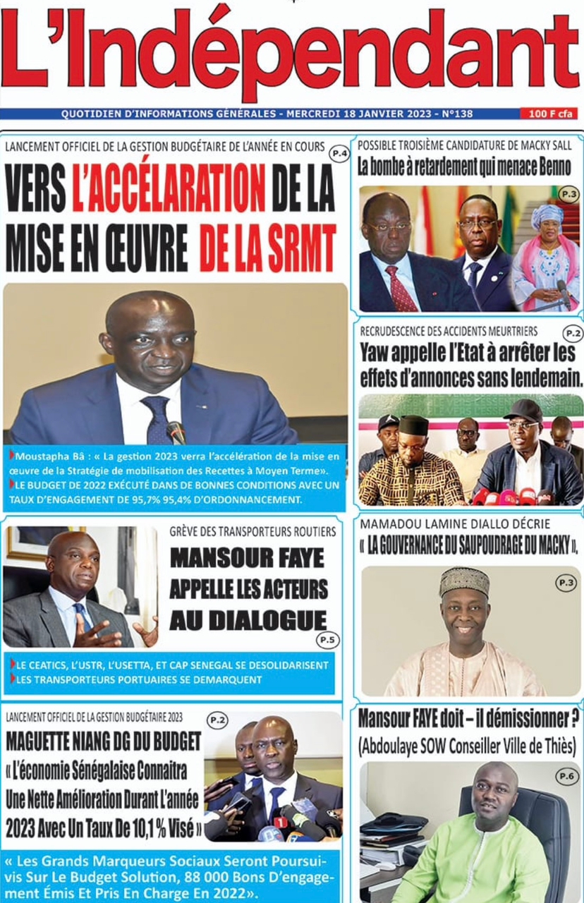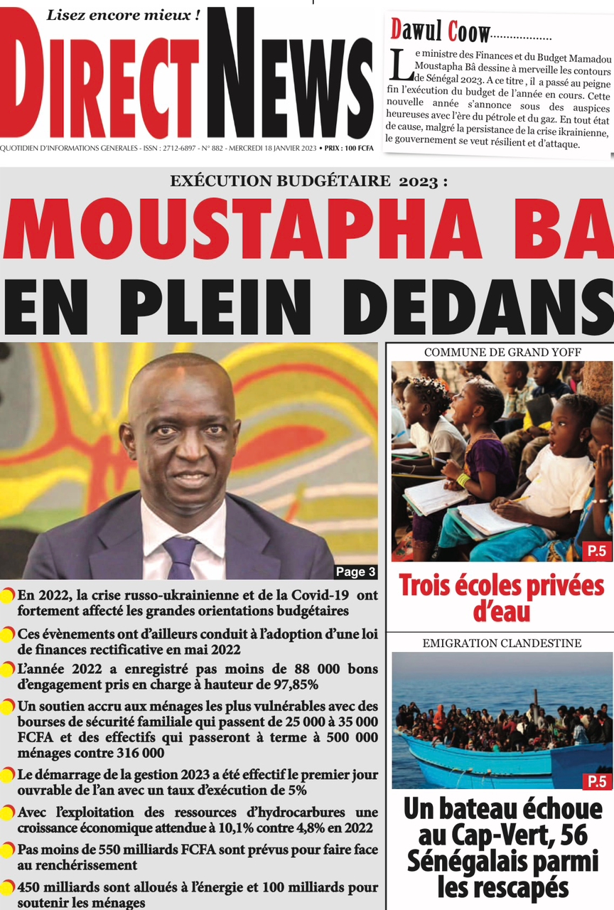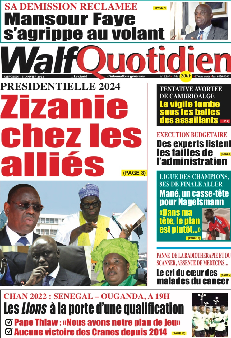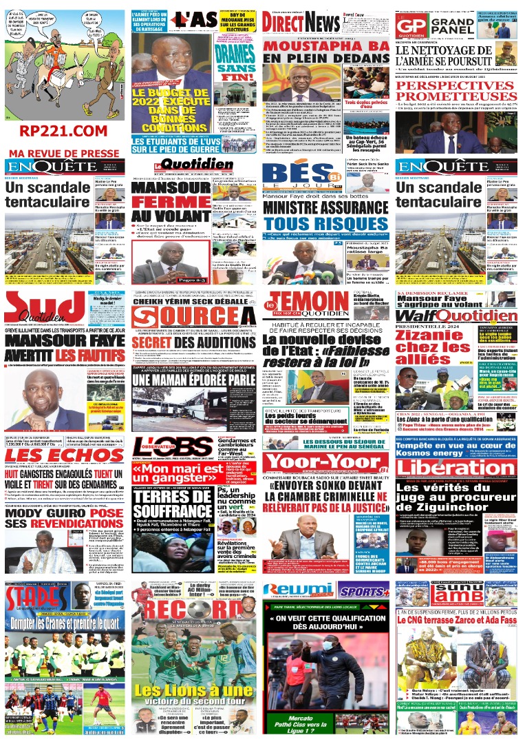 A LA UNERevue de presseSENEGALSports Ma revue de Presse : Retrouvez la Une des journaux parus ce mercredi 18 janvier 2023 By Alassane Dramane - 18 janvier 2023 0 652 Share on Facebook Tweet on Twitter Tous les matins, retrouvez la revue des titres qui font l’actualité du jour sur votre site Kéwoulo. Cette revue de presse est offerte par Ma Revue de Presse. Merci de défiler vers les bas pour appercevoir les journaux….
