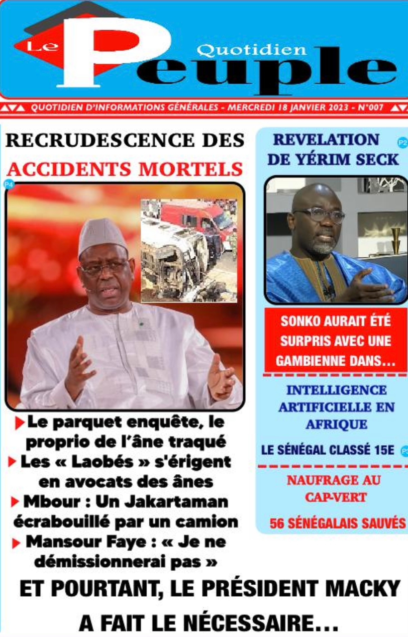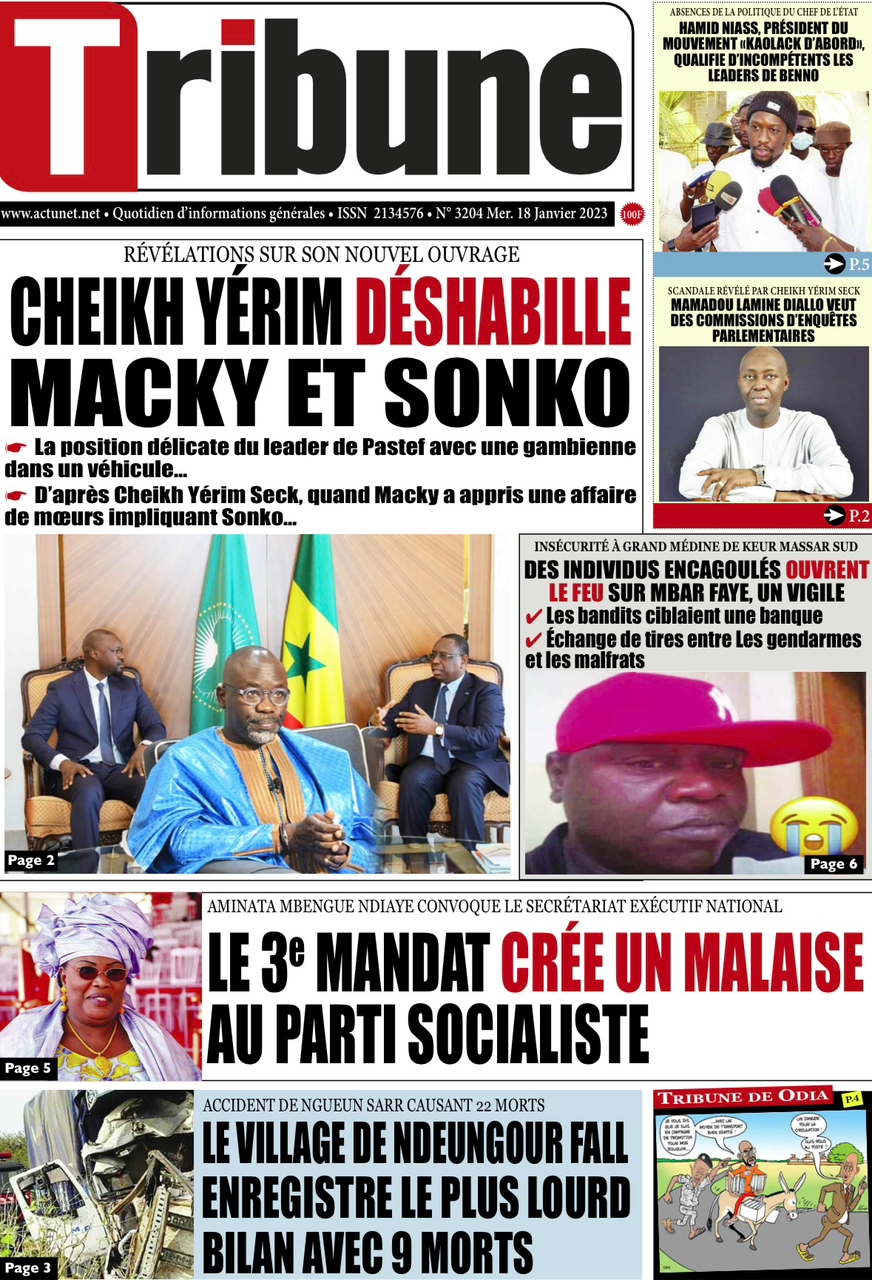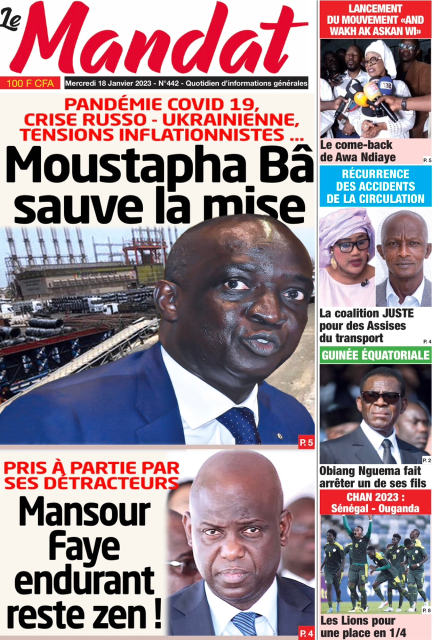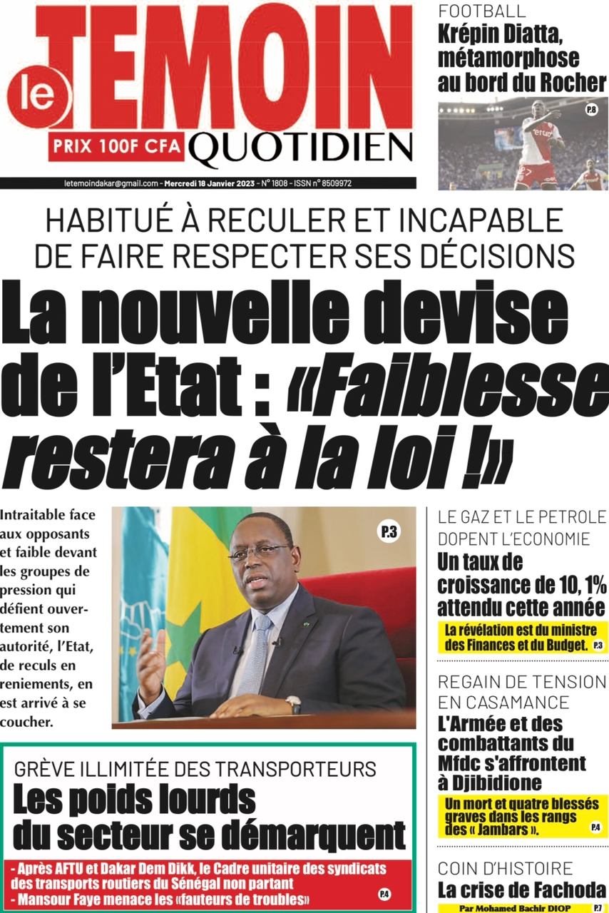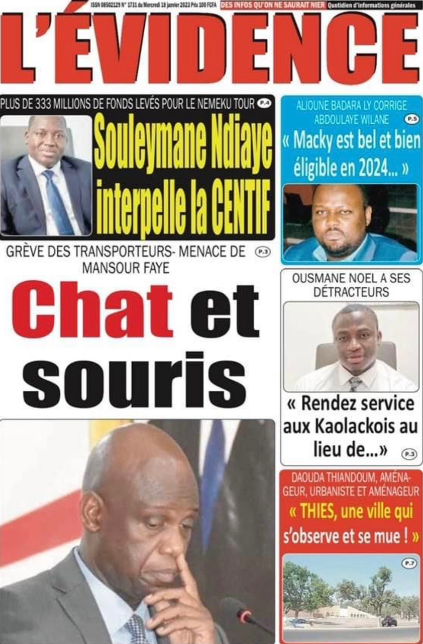 A LA UNERevue de presseSENEGALSports Ma revue de Presse : Retrouvez la Une des journaux parus ce mercredi 18 janvier 2023 By Alassane Dramane - 18 janvier 2023 0 652 Share on Facebook Tweet on Twitter Tous les matins, retrouvez la revue des titres qui font l’actualité du jour sur votre site Kéwoulo. Cette revue de presse est offerte par Ma Revue de Presse. Merci de défiler vers les bas pour appercevoir les journaux….