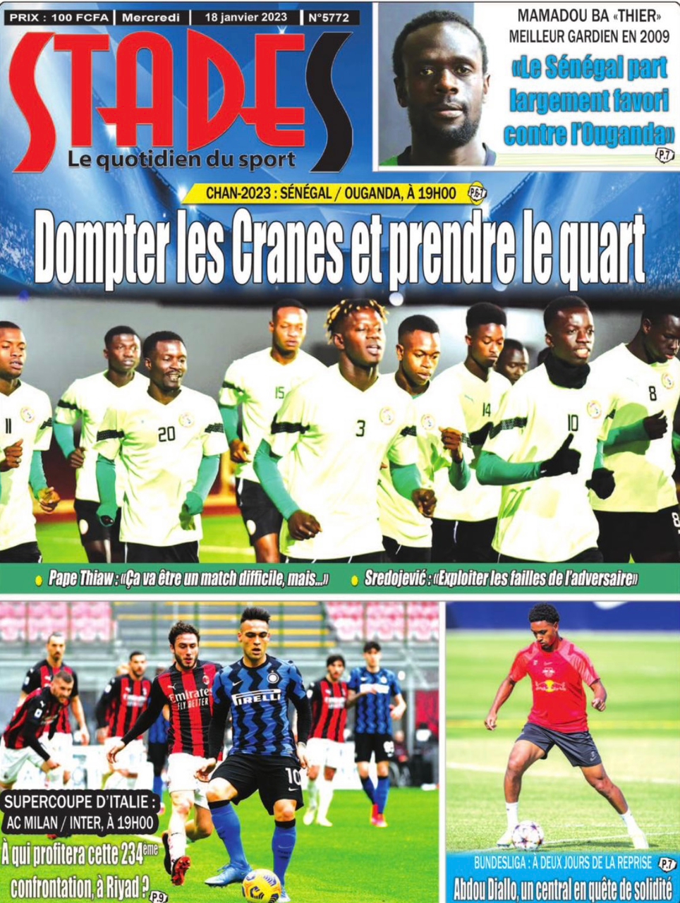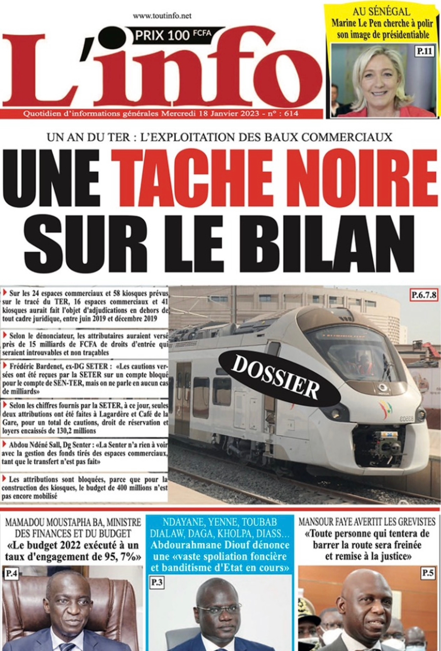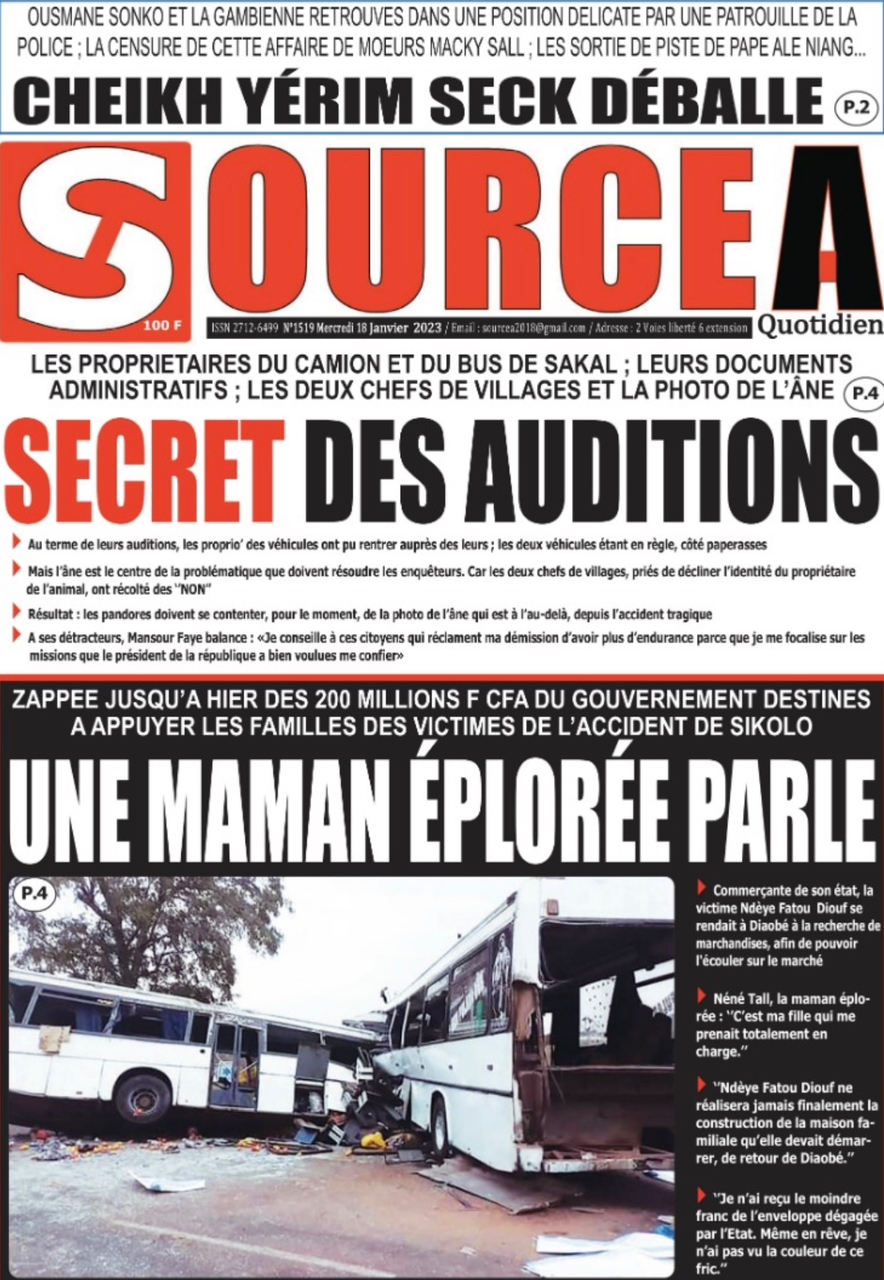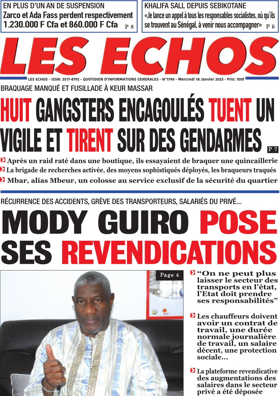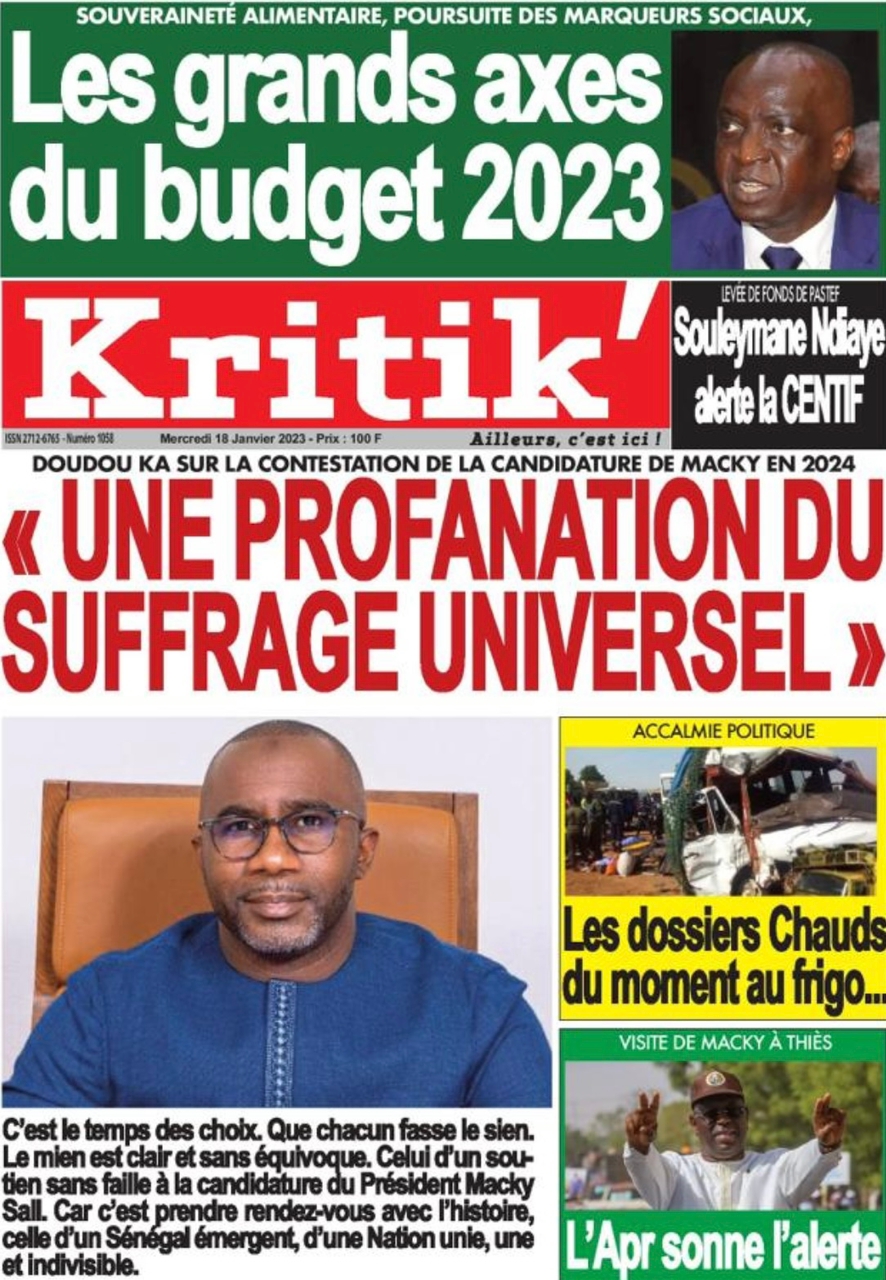 A LA UNERevue de presseSENEGALSports Ma revue de Presse : Retrouvez la Une des journaux parus ce mercredi 18 janvier 2023 By Alassane Dramane - 18 janvier 2023 0 652 Share on Facebook Tweet on Twitter Tous les matins, retrouvez la revue des titres qui font l’actualité du jour sur votre site Kéwoulo. Cette revue de presse est offerte par Ma Revue de Presse. Merci de défiler vers les bas pour appercevoir les journaux….