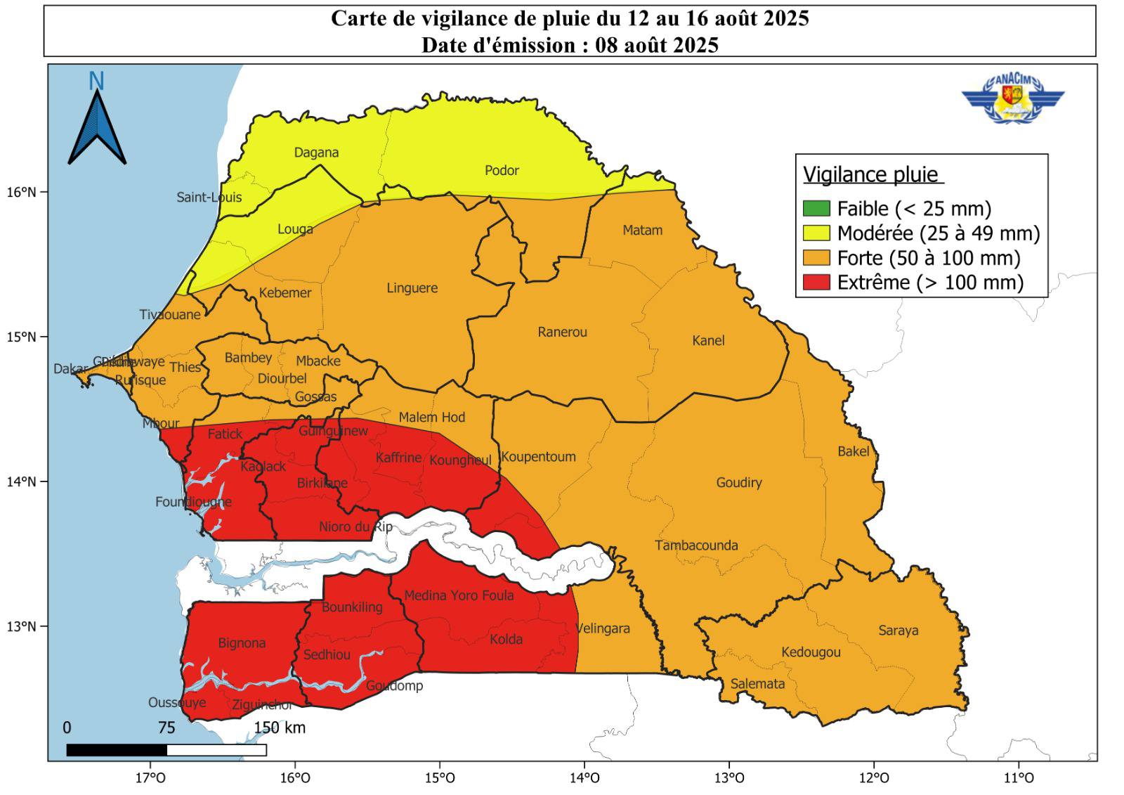 L’Agence nationale de l’aviation civile et de la météorologie (Anacim) annonce un épisode pluvieux prolongé sur l’ensemble du pays, avec deux vagues distinctes qui devraient arroser largement le territoire entre le 8 et le 16 août 2025.