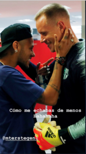 La star brésilienne du club de la capitale parisienne était en voyage à Barclone. Venu pour une opération avec l’un des ses sponsors, Neymar en a profité pour rendre visite à ses anciens coéquipiers du Barça. Il a pris la pause avec Rakitic, Suarez ou encore ter Stegen, tous heureux de revoir l’attaquant du PSG.