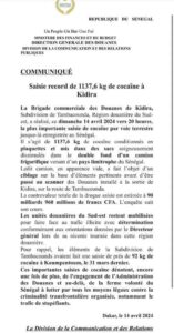 La Douane sénégalaise vient de taper fort à Kidira dans la région de Tambacounda avec une importante saisie de 1137,6kg de cocaine estimée à 90 milliards de francs CFA selon le communiqué de la Division de la Communication et des Relations Publiques (DCRP).Par ailleurs, récemment dans le mois de mars; les unités douanières ont intercetpté à Keur-Ayib des tranfiquants avec 11kg de cocaine et 200g de cannabis puis à Koumpentoum avec 94kg de cocaine.